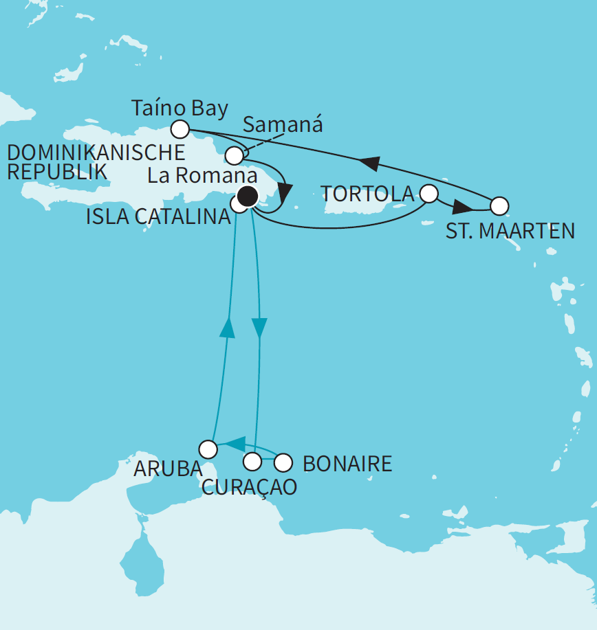 Tauchen Sie ein in die farbenprächtige Welt der Karibik und genießen Sie 14 unvergessliche Nächte voller Sonne, Lebensfreude und Entspannung. Starten Sie ab La Romana und entdecken Sie paradiesische Inseln wie Dom. Rep., Aruba, Bonaire, Curaçao, Tortola und St. Maarten – jede mit ihrem eigenen, unverwechselbaren Charme.